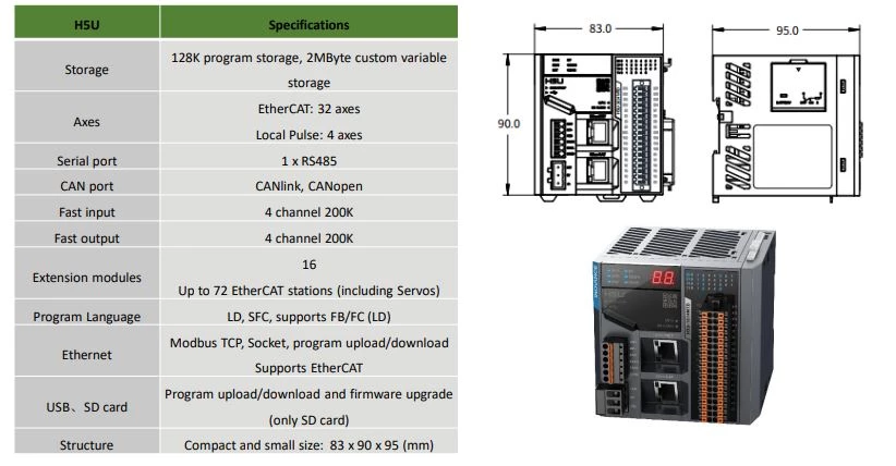 Procesory H5U Inovamce zostały wyposażone w pamięć programu do 128 tysięcy kroków. W standardzie jednostki główne z tej serii dysponują komunikacją Ethernet, EtheCAT, CAN oraz portami szeregowymi RS485. Dodatkowo producent wyposaży sterowniki PLC H5U w złącze USB oraz slot kart SD. Inovance podaje możliwość obsługi do 32 osi napędowych przez sterowniki PLC H5U Inovance. W tym do 32 osi po EtherCat, 16 po CANopen oraz 4 impulsowe. Jednostki centralne Inovanance H5U zasilane są napięciem 24VDC. Dodatkowo możliwości procesorów H5U można rozszerzyć z wykorzystaniem modułów rozszerzeń GL10 oraz GR10. Producent wyposażył PLC H5U w kompaktowe obudowy z tworzywa o stopniu ochrony IP20 z możliwością montażu na szynie DIN. Urządzenia mogą pracować w zakresie temperatur od -10 do +55 stopni Celsjusza.