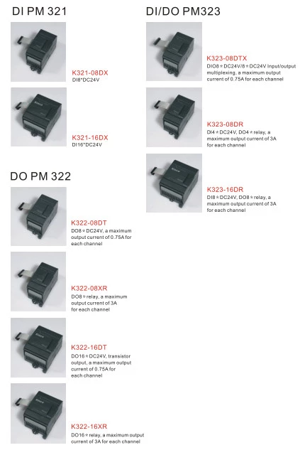 Moduły binarne dedykowane do sterowników PLC KINCO. Rozszerzenia Kinco instalowane są z prawej strony jednostki głównej. W ofercie znajdują się moduły wejść cyfrowych, moduły wyjść binarnych oraz moduły mieszane. Producent oferuje moduły 4, 8 lun 16 wejść cyfrowych. Moduły wyjściowe Kinco dostępne są w konfiguracji: 8-; 12- 16-punktowej. W zależności od wykonania moduły wyjść cyfrowych dysponują wyjściami tranzystorowymi lub przekaźnikowymi. Dodatkowo KInco oferuje moduły mieszane z konfiguracją: 8 wejść/4 wyjścia przekaźnikowe; 8 wejść/8 wyjść przekaźnikowych, 8 wejść/8 wyjść tranzystorowych; 4 wejść/4 wyjścia przekaźnikowe oraz 4 wejścia/4 wyjścia tranzystorowe.