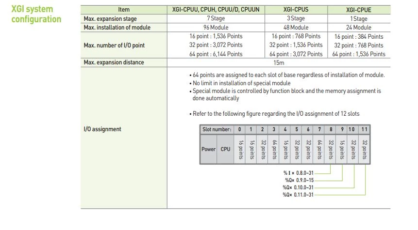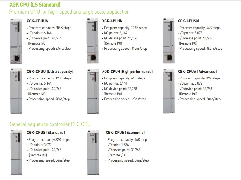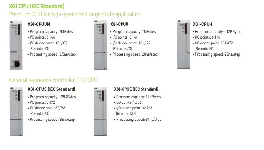 Sterowniki PLC XGI sprawdzają się w aplikacjach wymagających złożonych algorytmów oraz niezawodności działania systemów sterowania. Producent wyposażył jednostki w pamięć do 2 mb. Urządzenia dysponują portami szeregowymi RS232C oraz RS485, a także portem Ethernet. Operator ma możliwość rozbudowy jednostki głównej XGI do 131 072 punktów wejść/wyjść. Do jednego sterownika PLC można maksymalnie podpiąć 96 modułów w 7 klastrach po 12 modułów. Producent podaje prędkość na poziomie od 8,5ns/krok.