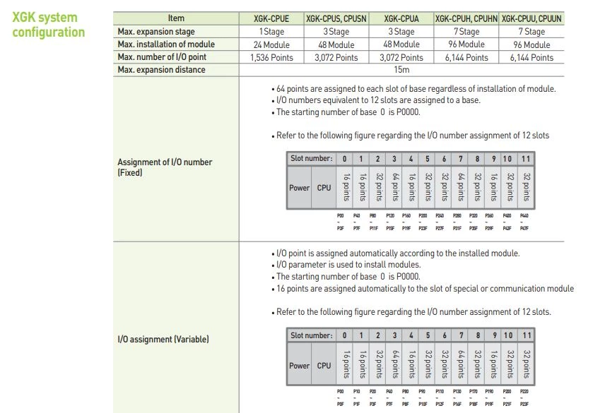 PLC XGK LG programowane są w języku LD oraz IL. Dodatkowo operator ma możliwość definiowana własnych bloków funkcyjnych. Komunikacja w CPU XGK odbywa się po porcie Ethernet lub portach szeregowych RS232C i RS485. Producent deklaruje pamięć do 256 000 kroków oraz prędkość od 8,5ns/krok. Jednostki główne można rozbudować maksymalnie do 65 536 punktów wejść/wyjść z wykorzystaniem do 96 modułów rozszerzeń