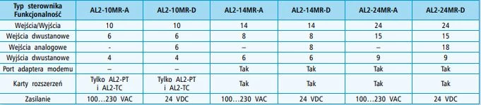 Serowniki PLC Alpha 2 dostępne są w konfiguracji 10-punktowej, 14-punktowej oraz z 24 punktami wejść/wyjść. Wszystkie sterowniki posiadają zabudowane wyjścia przekaźnikowe. Należy pamiętać iż jednostki 14-punktowe można rozbudować maksymalnie do 18 punktów I/O natomiast AL2-24MR- mają możliwość rozbudowy do 28 punktów I/O. PLC AL2-10MR nie mają możliwości rozbudowy o dodatkowe punkty wejść wyjść. 10-punktowe sterowniki można rozszerzyć tylko przy pomocy kary Al2-PT oraz AL2-TC. Jednostki główne CPU Mitsubishi Alpha 2 można podzielić również ze względu na napięcie zasilania. Wejścia cyfrowe w sterownikach PLC o zasilaniu 24 V DC są przełączne, co oznacza iż mogą zostać wykorzystane jako wejścia analogowe napięciowe 0...10 V o rozdzielczości 9 bitów. Sterowniki o zasilaniu Alpha2 230 V AC nie dysponują przełącznymi wejściami cyfrowymi. Zabudowany wyświetlacz LCD dysponuje 4 liniami po 12 znaków. Z poziomy wyświetlacza operator ma możliwość podglądu komunikatów, alarmów. Dodatkowo można przesłać informacje z ekranu w postaci SMS.