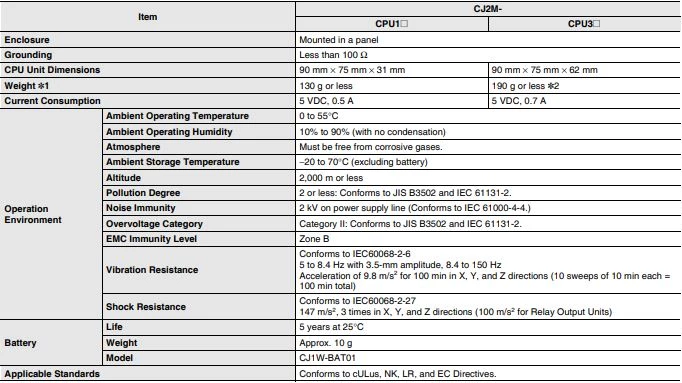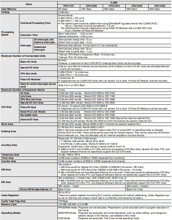 Wszystkie jednostki centralne CJ2 Omron mają możliwość rozbudowy do 40 modułów rozszerzeń oraz 2560 punktów I/O. W zależności od wybranego modelu jednostki dysponują pamięcią programu od 5 to 400 tysięcy kroków. Pamięć danych natomiast to 64 - 832 tysięcy kroków. PLC CJ2 Omron charakteryzują się obsługą 4 osi. Poszczególne modele różnią się liczbą oraz rodzajem portów komunikacyjnych. Omron oferuje jednostki główne CJ2 z portami komunikacyjnymi: EtherNet/IP, Ethernet TCP/IP, portem szeregowym RS-232 oraz z portem USB. Jednostki z portem Ethernet zostały dodatkowo wyposażone w możliwość rozbudowy o karty komunikacyjne.