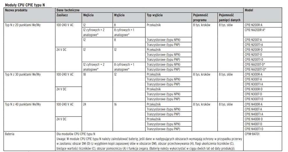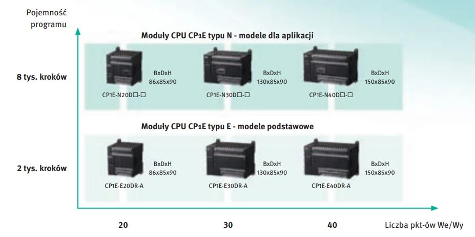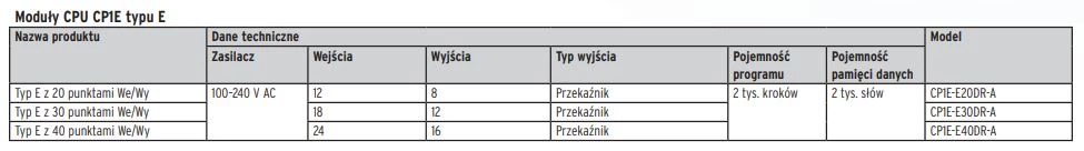 Sterowniki PLC CP1E Omron dedykowane do prostych aplikacji automatyki przemysłowej. Jednostki zostały wyposażone w trzy porty komunikacyjne. PLC z zabudowanym portem RS232C są płytsze o 20 mm od pozostałych. Pojemność programu jednostek podstawowych CP1E wynosi do 8 tysięcy kroków.