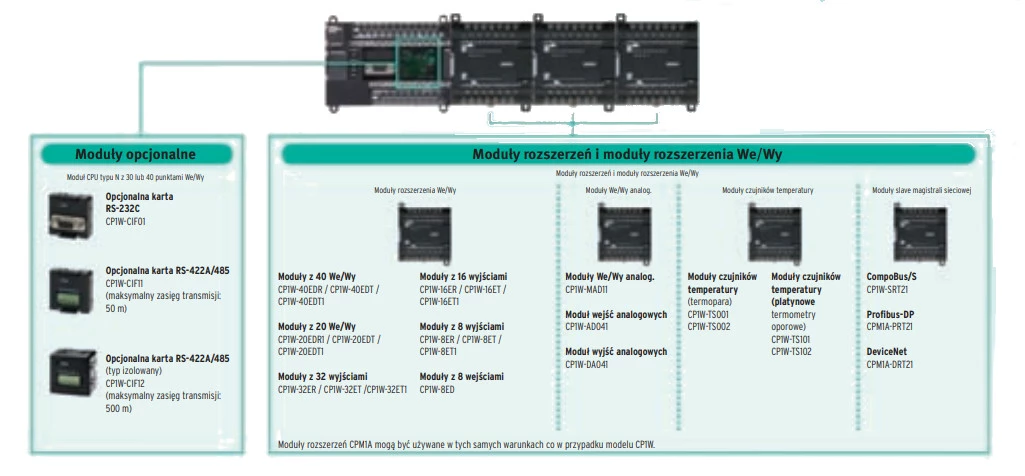 W ofercie dostępne są jednostki główne 10-, 14-,20-,30- oraz 40-punktowe. Ponadto Omron oferuje szereg modułów pozwalających na zwiększenie możliwości technicznych PLC.W zależności od modelu można dodatkowo rozbudować jednostkę główna maksymalnie do 160 punktów I/O lub do 3 modułów rozszerzeń. W zależności od wykonania dysponują wyjściami przekaźnikowymi, tranzystorowymi typu SINK lub tranzystorowymi typu Source. Biorąc pod uwagę napięcie zasilania oferowane są jednostki o zasilaniu AC oraz DC.