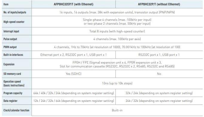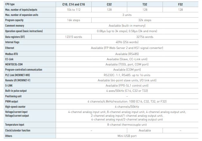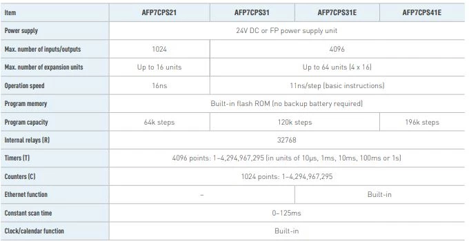 Panasonic w swojej ofercie posiada szeroką gamę sterowników PLC. Dostępne są PLC w wykonaniu kompaktowym oraz modułowym. Modułowe sterowniki FP7 sprawdzają się w aplikacjach przemysłu 4.0. W standardzie zostały wyposażone w komunikacje Ethernet oraz pamięć do 220 tysięcy kroków. Ponadto dostępne są jednostki obsługujące funkcję szyfrowania. PLC FP2SH charakteryzują się czasem skanowania wynoszącym 1ms na 20 tysięcy kroków. Kompaktowe sterowniki FP0H zostały wyposażone w 2 porty Ethernet oraz pamięcią do 64 tysięcy kroków. CPU FP0H Panasonic można rozszerzyć do 384 punktów wejść/wyjść. Sterowniki z rodziny FP0R zwane także ultramikroskopowymi PLC Panasonic charakteryzują się bardzo małą obudową dzięki czemu z powodzeniem sprawdzają się w wąskich przestrzeniach.  Ekonomiczne PLC FP-X0 Panasonic dedukowane do aplikacji związanych ze sterowaniem ruchem. Sterowniki te można rozbudować do 216 punktów wejść/wyjść.