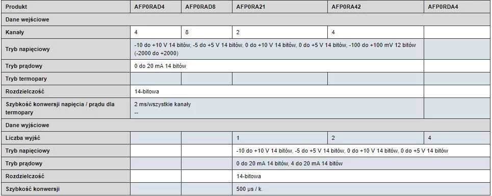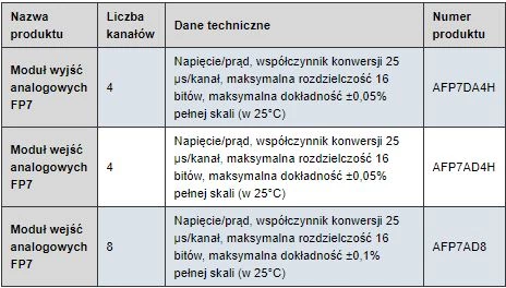 Moduły analogowe dedykowane do współpracy ze sterownikami PLC FP Panasonic. Moduły pozwalają na rozbudowanie możliwości jednostki głównej CPU o dodatkowe punkty wejść/wyjść analogowych. W ofercie znajdują się moduły wejść analogowych, moduły wyjść analogowych, moduły temperaturowe czy moduły wagowe.