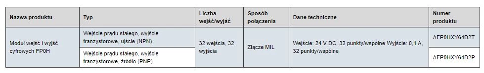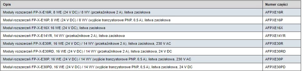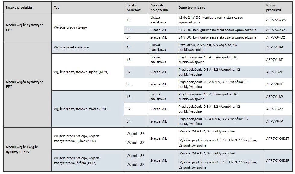 Moduły binarne dedykowane do współpracy ze sterownikami PLC Panasonic FP. W ofercie znajdują się moduły wejść cyfrowych, moduły wyjść tranzystorowych, modły wyjść przekaźnikowych oraz modułu mieszane. W zależności od wykonania różnią się nie tylko typem punktów wejść/wyjść ale również liczbą. Rozszerzenia cyfrowe FP przystosowane są do montażu na szynie DIN z prawej strony jednostki głównej.
