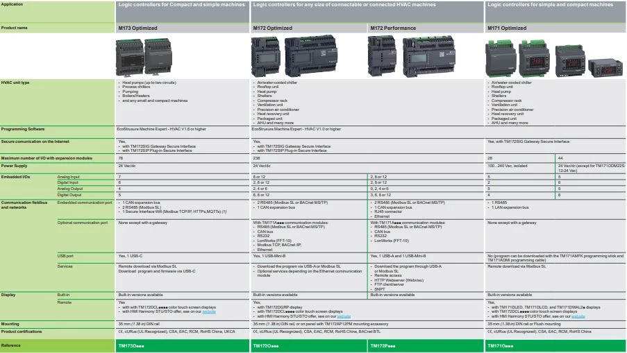 Sterowniki PLC Modicon M171 oraz M172 zostały stworzone z myślą o sterowaniu ogrzewaniem, wentylacją czy klimatyzacją. Przeznaczone są do małych oraz średnich układów sterownia. Dostępne w wersji do montażu na szynie DIN oraz montażu podtynkowego.