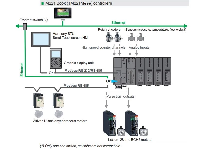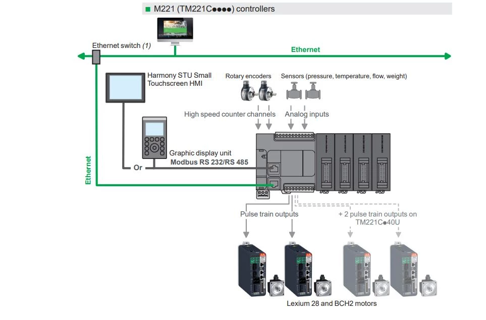 Sterowniki PLC Modicon M221 Schneider Electric dostępne są w dwóch wersjach. Producent oferuje jednostki centralne w wersji modułowej oraz kompaktowej. Urządzenia konfigurowane są za pomocą narzędzia SoMachine Basic. Sterowniki PLC Modicon M221 oferują możliwość rozbudowy o dodatkowe moduły wejść/wyjść oraz komunikacyjne. Jednostki centralne Modicon można rozbudować do 264 punktów wejść oraz wyjść cyfrowych a także do 114 punktów analogowych. Wszystkie sterowniki zostały wyposażone w port Ethernet, port USB, slot kart SD oraz port szeregowy i port programujący. Schneider Electric oferuje jednostki główne o różnej konfiguracji wejść oraz wyjść. Ponadto sterowniki PLC posiadają wbudowane 2 wejścia analogowe. Jednostki centralne Modicon M221 sprawdzają się w aplikacjach maszynowych. Seria sterowników PLC M221 Modicon Schneider Electric znajduje swoje zastosowanie w maszynach, gospodarce wodno-ściekowej, a także dla branży spożywczej.