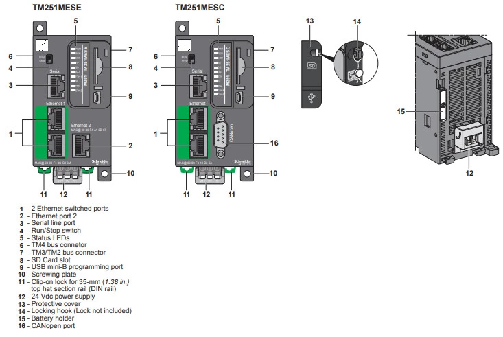Jednostki główne M251 Schneider Electric zasilane są napięciem 24 VDC. Sterownik PLC Modicon M251 można rozbudować o 14 modułów wejść/wyjść zdalnych oraz 7 modułów lokalnych. Producent wyposażył jednostki centralne Modicon M251 w 64 MB pamięci systemu RAM i 8 MB pamięci programu. Dodatkowo jednostki dysponują 128 MB pamięci Flasch dla kopii zapasowych programu użytkownika. Pamięć sterownika M251 M251 można dodatkowo rozbudować za pomocą opcjonalnej karty SD o pojemności 16 GB. W standardzie jednostki główne zostały wyposażone w zabudowany zegar czasu rzeczywistego RTC oraz serwer www. PLC dysponują szeregiem portów komunikacyjnych: Ethernet, RS-232, RS-485, złącze USB, slot kart SD.