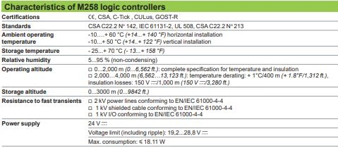 PLC Modicon M258 zostały wyposażone w 2 procesory. Procesor Core 1 odpowiada za logikę programu, natomiast procesor Core 2 za komunikacje. Urządzenia charakteryzują się czasem wykonywania instrukcji na poziomie 22ns. Dodatkowo urządzenia te obsługują do 2400 punktów wejść wyjść. Producent wyposażył PLC w 64MB pamięci RAM oraz 128 MB pamięci Flash. W standardzie jednostko główne dysponują komunikacja Ethernet oraz Modbus. Ponadto dostępne są jednostki z komunikacją CANopen czy Profibus DP.Wszystkie moduły zostały wyposażone w wymienne konektory, a połączenia elektryczne wykonane zostały za pomocą zacisków sprężynowych. Sterowniki te dysponują funkcją obsługi sygnałów analogowych (np. sygnały z czujników, sygnały z siłowników, czujników temperatury czy regulatorów PID). Ponadto PLC M258 mają 8 wbudowanych szybkich liczników 100kHz i 4 szybkie wyjścia.