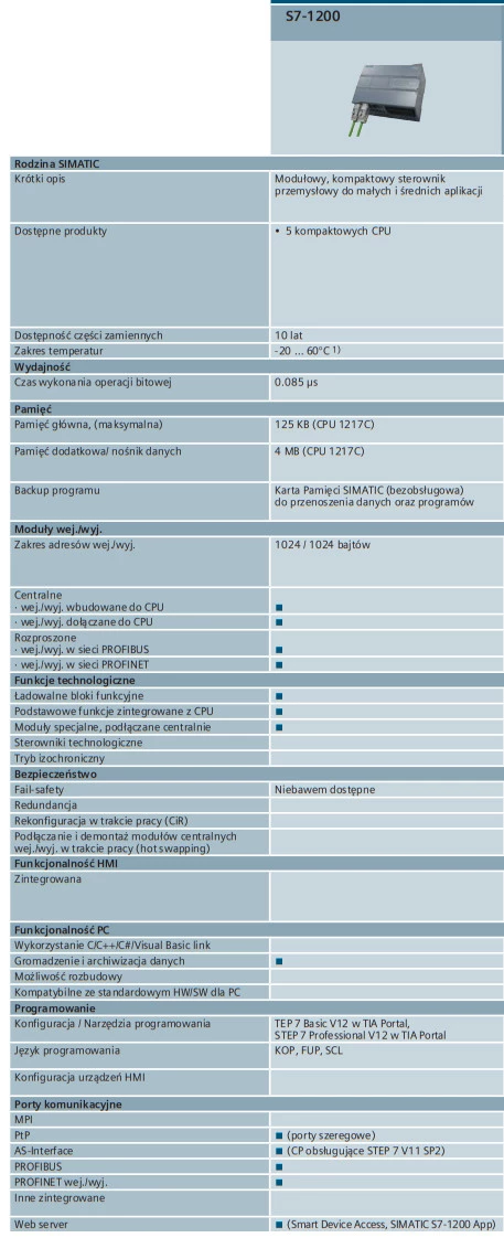 Simatic S7-1200 służą do zastosowań przemysłowych. Sterowniki moją możliwość rozbudowy o dodatkowe moduły wejść/wyjść, moduły komunikacyjne i funkcyjne. Dzięki szerokiej ofercie produktów SIMATIC można dobrać właściwy sterownik, zarówno do prostej, jak i zaawansowanej aplikacji. Dzięki rozbudowanym modułom komunikacyjnym S7-1200 umożliwiony jest zdalny dostęp do aplikacji. Dodatkowym atutem sterowników PLC SIMATIC S7-1200 jest integracja w TIA Portal. Połączenie innowacyjnych funkcji TIA Portal ze wbudowaną diagnostyką systemową wielokrotnie zwiększa efektywność pracy. Sterowniki SIMATIC S7 to wydajne, skalowalne, wielofunkcyjne systemy sterowania.