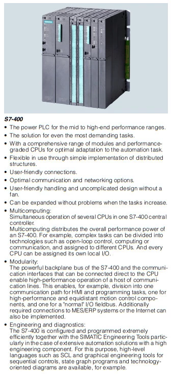 Sterowniki PLC Siemens S7-400 cechują się wysoką wydajnością oraz szybkimi czasami cyklu. Sprawdza się to przede wszystkim w złożonych systemach sterowania czy regulacji. Możliwość rozbudowy o różne moduły daje możliwość dostosowania sytemu niemal do każdej aplikacji. Siemens wyposażył PLC S7-400 w szeroką gamę portów komunikacyjnych. Przyczynia się to do uzyskania łatwego połączenia z panelami HMI czy innymi urządzeniami w danym systemie. Zaawansowane funkcje diagnostyczne wpływają na przyspieszenie procesu diagnostyki, analizy oraz rozwiązywania problemów.