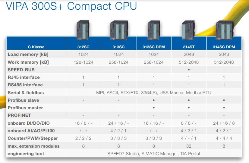 Jednostki główne 300S+ Compact zostały wyposażone w port Ethernet, RS485. W zależności od wybranego modelu CPU 300S+ Compact dysponują obsługą protokołu Profibus slave, Profibus master, MPI, ASCII, ETX/ETX czy Modbus RTU. Jednostki można rozbudować o 8 lub 32 moduły rozszerzeń. W ofercie dostępne są PLC z zabudowanymi wejściami/wyjściami analogowymi, wejściami temperatury pod czujniki PT100. Konfiguracja CPU 300S+ Comapct podobnie jak standard konfiguruje się przy pomocy tych samych narzędzi.