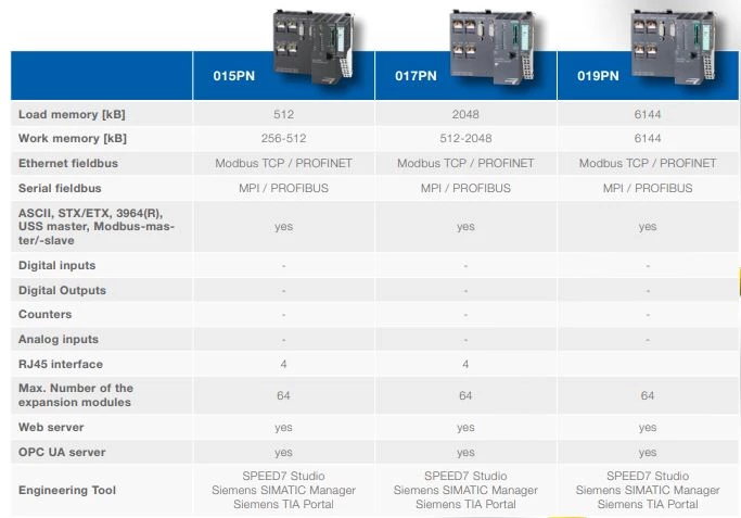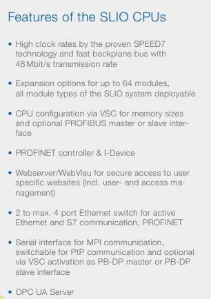 Jednostki główne SLIO Yaskawa to wysoka wydajność w kompaktowej obudowie. CPU SLIO współpracuje z systemami VIPA 100V, 200V, 300S oraz 500S. Jednostki centralne SLIO VIPA zostały wyposażone w technologię SPEED7. Dzięki dużym zasobom pamięci roboczej, sięgającej do 6 144 KB daje duże możliwości programowe automatykom. W zależności od modelu CPU SLIO Vipa dysponują komunikacją Etherner, Profinet, Profibus, Ether Cat czy Modbus TCP. Konfiguracja sterowników PLC SLIO VIPA odbywa się za pomocą SPEED7 Studio, EtherCAT Manager dla STEP 7 V5.6, SIMATIC Manageri TIA Portal. System zdalnych wejść/wyjść SLIO Yaskawa dysponuje magistralą wewnętrzną do 48MBits.