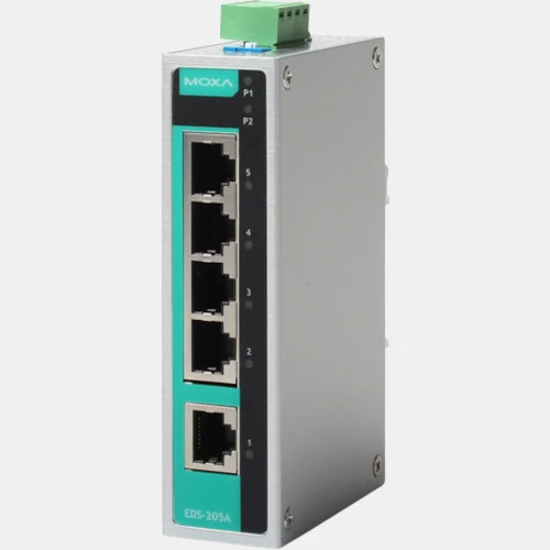 Switch EDS-205A Moxa posiada 5 ethernetowych portów 10/100BaseTx ze złączem RJ45. Niezarządzalny switch zasilany jest napięciem w przedziale 9,6...60 VDC. 5-portowy Switch przystosowany jest do montażu na szynie DIN z możliwością montażu naściennego. Niezarządzalne switche Moxa cechują się wysoką wytrzymałością EMI/EMC. Urządzenie Moxa posiada ochronę przed odwrotną polaryzacją oraz przeciążeniem. Zużycie prądu dla urządzenia wynosi 9 mA. Switch EDS-205A posiada stopień ochrony IP30 oraz może pracować w przedziale temperatury od -10 do 60 st. Celsjusza. EDS-205A wyposażono w aluminiowa obudowę chroniącą przed wstrząsami i wibracjami o wymiarach: 30 x 115 x 70 mm i wadze 0,175 kg. Switch EDS-205A Moxa w wykonaniu przemysłowym stosowany jest w strefach zagrożonych wybuchem, w przemyśle morskim, a także w transporcie.