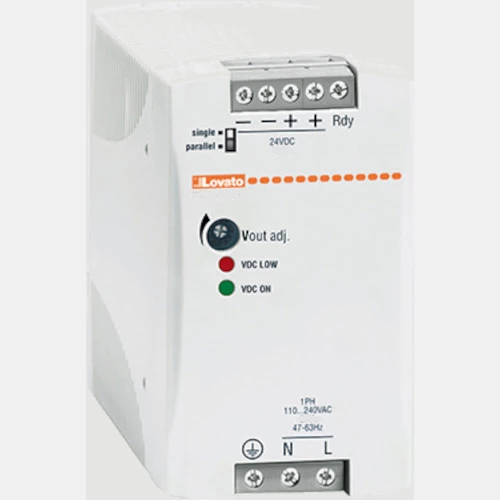Moduł zasilający PSL106024o napięciu wyjściowym 24VDC. Napięcie zasilania wynosi 100...240VAC/90...375 V DC. Zasilacz PSL106024 pobiera prąd z sieci 1,5 A, zaś częstotliwość zasilania wynosi 47...63 Hz. Prąd wyjściowy 2,5 A osiągamy przy mocy zasilacza wynoszącej 60 W. Sprawność urządzenia wynosi >89%. Moduł posiada zieloną diodę LED, która działa jako wskaźnik obecności napięcia. PSL106024 jednofazowy Lovato może pracować w temperaturze -40...70 °C. Zasilacz Lovato wykonany został w obudowie plastikowej o stopniu ochrony IP20 i dedykowany jest do montażu na szynę DIN. Zasilacz 24VDC PSL106024 posiada wymiary 90 x 115 x 40,5 mm i wagę 400 g. PSL106024 Lovato Electric sprawdza się zarówno w aplikacjach automatyki przemysłowej jak i budynkowej.